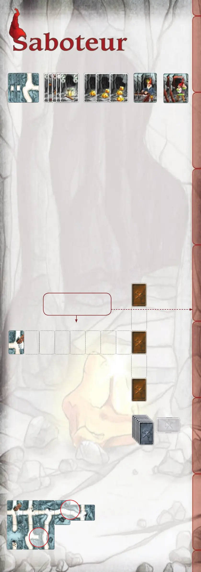 • 4 players: 1 saboteur and 4 gold miners • 8 players: 3 saboteurs and 6 gold miners