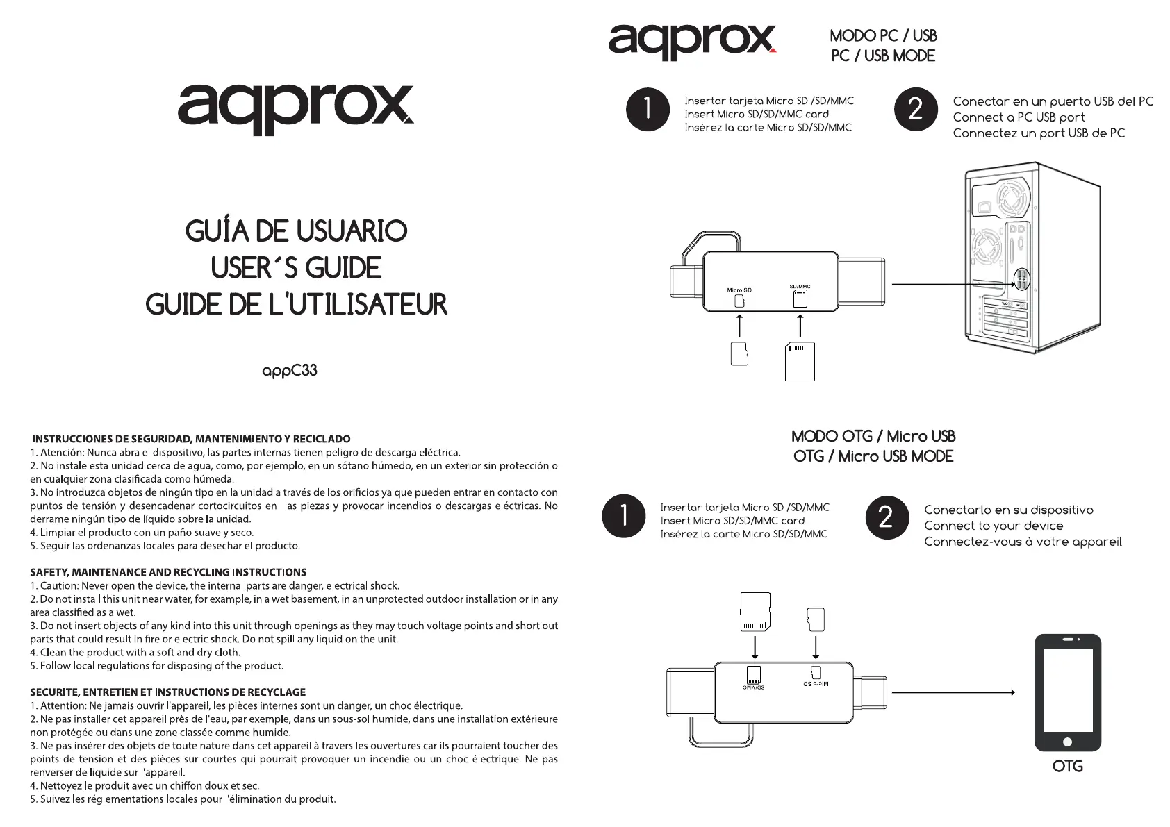 Läs gratis den bruksanvisning för Approx APPC33 (4 sidor) i kategorin Minneskortläsare. Guiden har ansetts hjälpsam av 12 personer och har ett genomsnittsbetyg på 4.8 stjärnor baserat på 6.5 recensioner. Har du en fråga om Approx APPC33 eller vill du ställa frågor till andra användare av produkten? Ställ en fråga