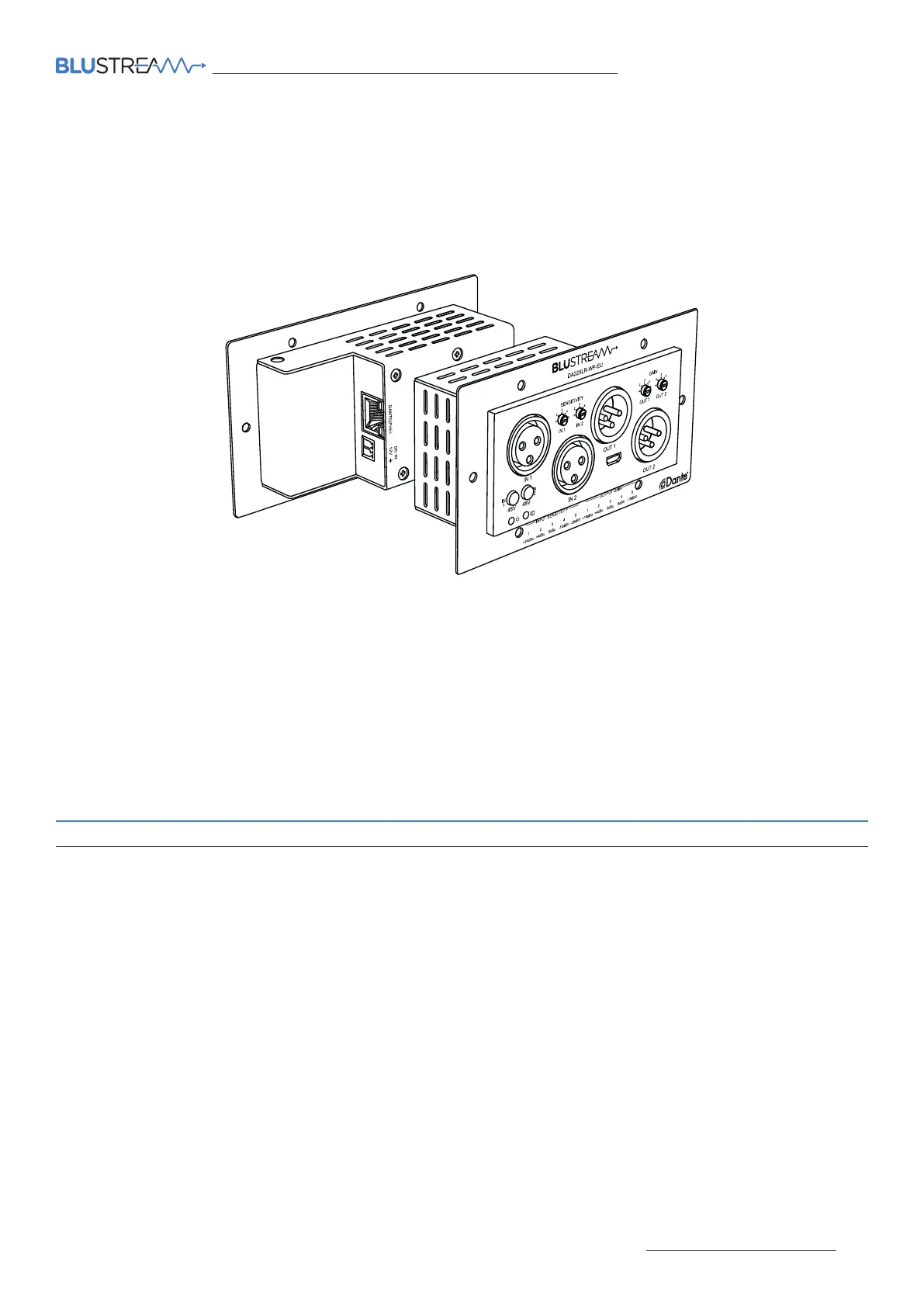 •  Dante® network wall plate interface for 2 x audio inputs and 2 x audio outputs