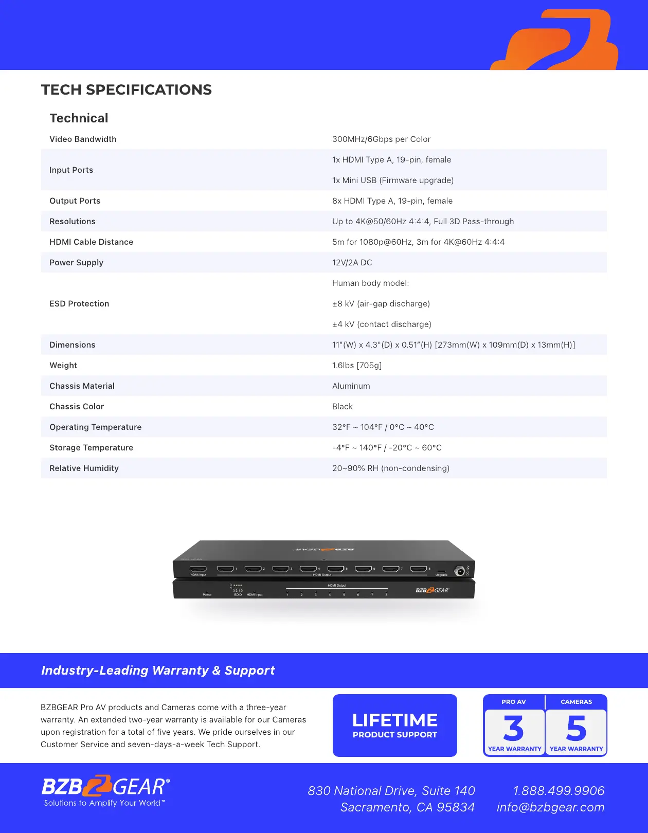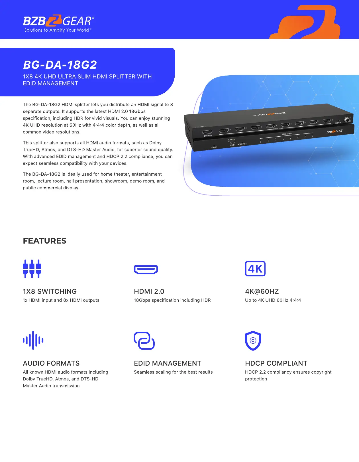 The BG-DA-18G2 HDMI splitter lets you distribute an HDMI signal to 8