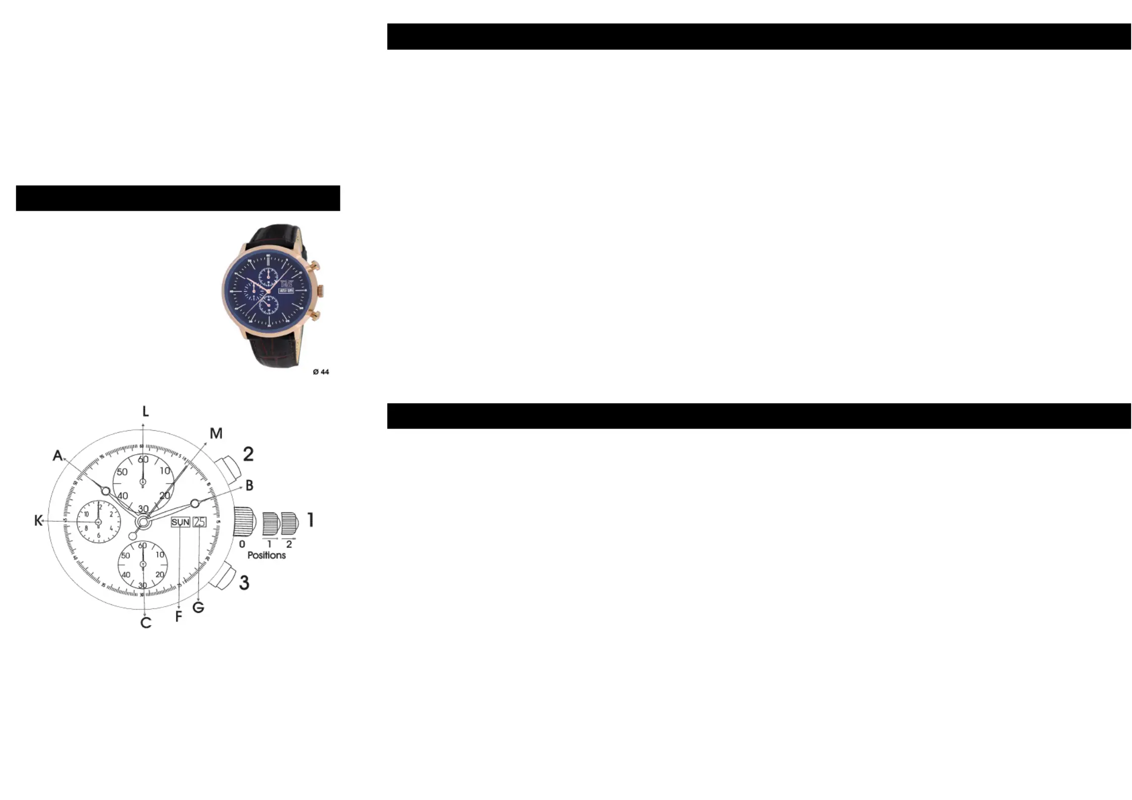 Pull out the crown (1) to position 2. Hands (K), (M) and (L) will turn