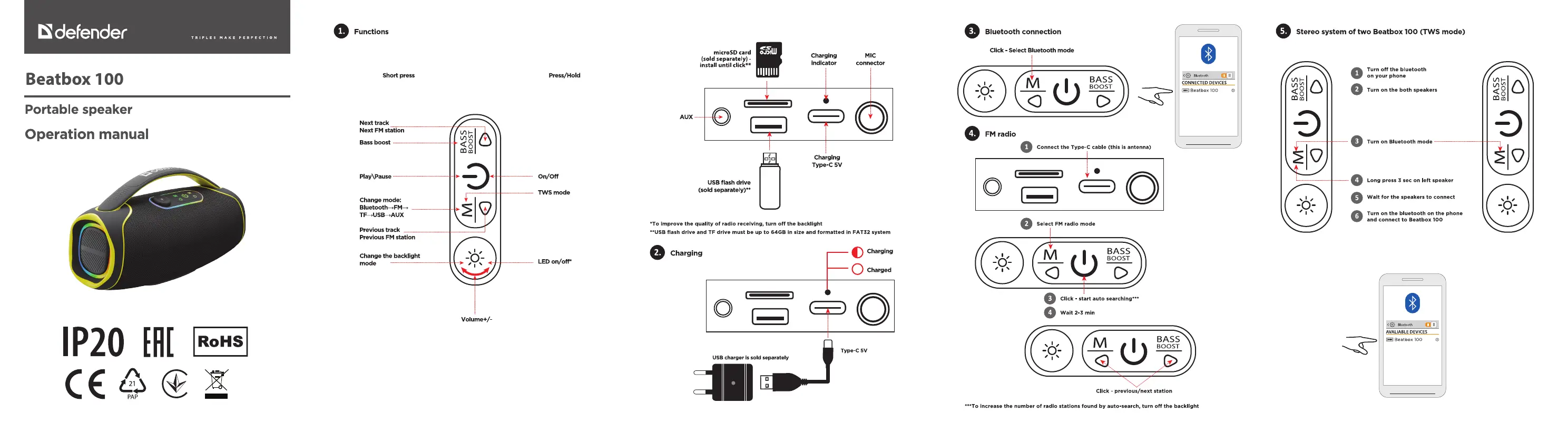 Läs gratis den bruksanvisning för Defender BeatBox 100 (8 sidor) i kategorin högtalare. Guiden har ansetts hjälpsam av 14 personer och har ett genomsnittsbetyg på 5.0 stjärnor baserat på 7.5 recensioner. Har du en fråga om Defender BeatBox 100 eller vill du ställa frågor till andra användare av produkten? Ställ en fråga