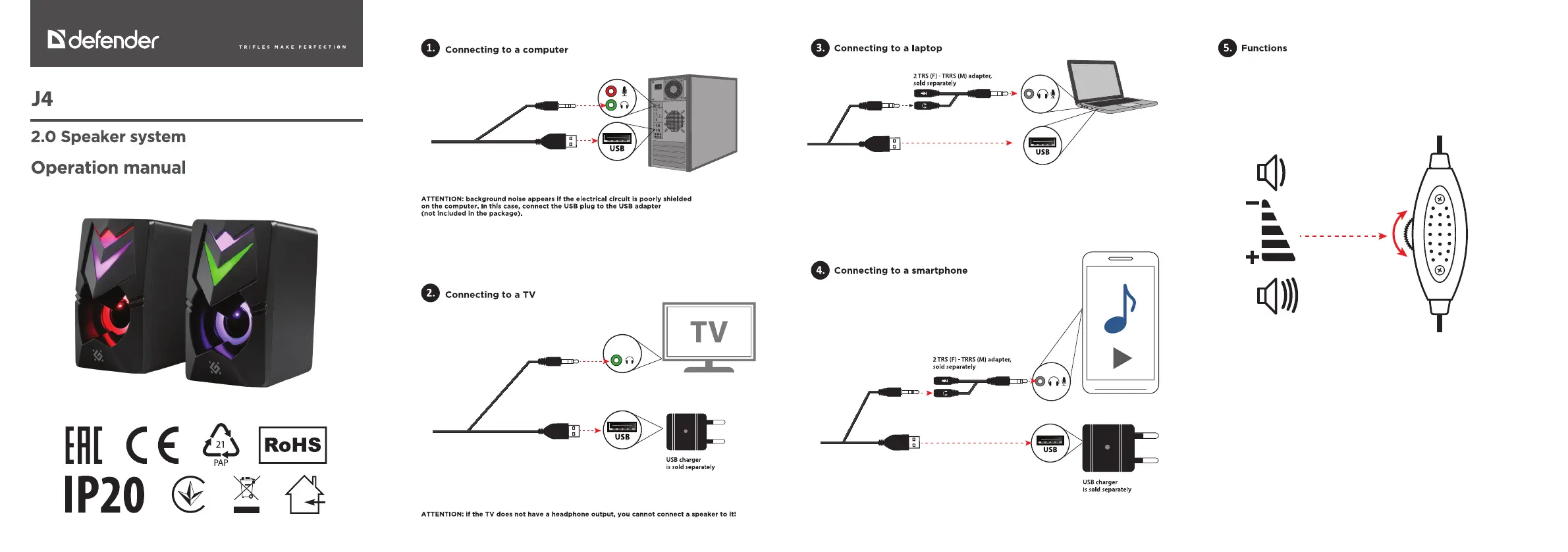 Läs gratis den bruksanvisning för Defender J4 (8 sidor) i kategorin högtalare. Guiden har ansetts hjälpsam av 30 personer och har ett genomsnittsbetyg på 4.3 stjärnor baserat på 15.5 recensioner. Har du en fråga om Defender J4 eller vill du ställa frågor till andra användare av produkten? Ställ en fråga
