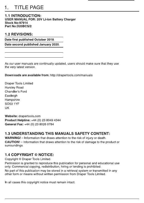 Draper D20 97914 Bruksanvisning