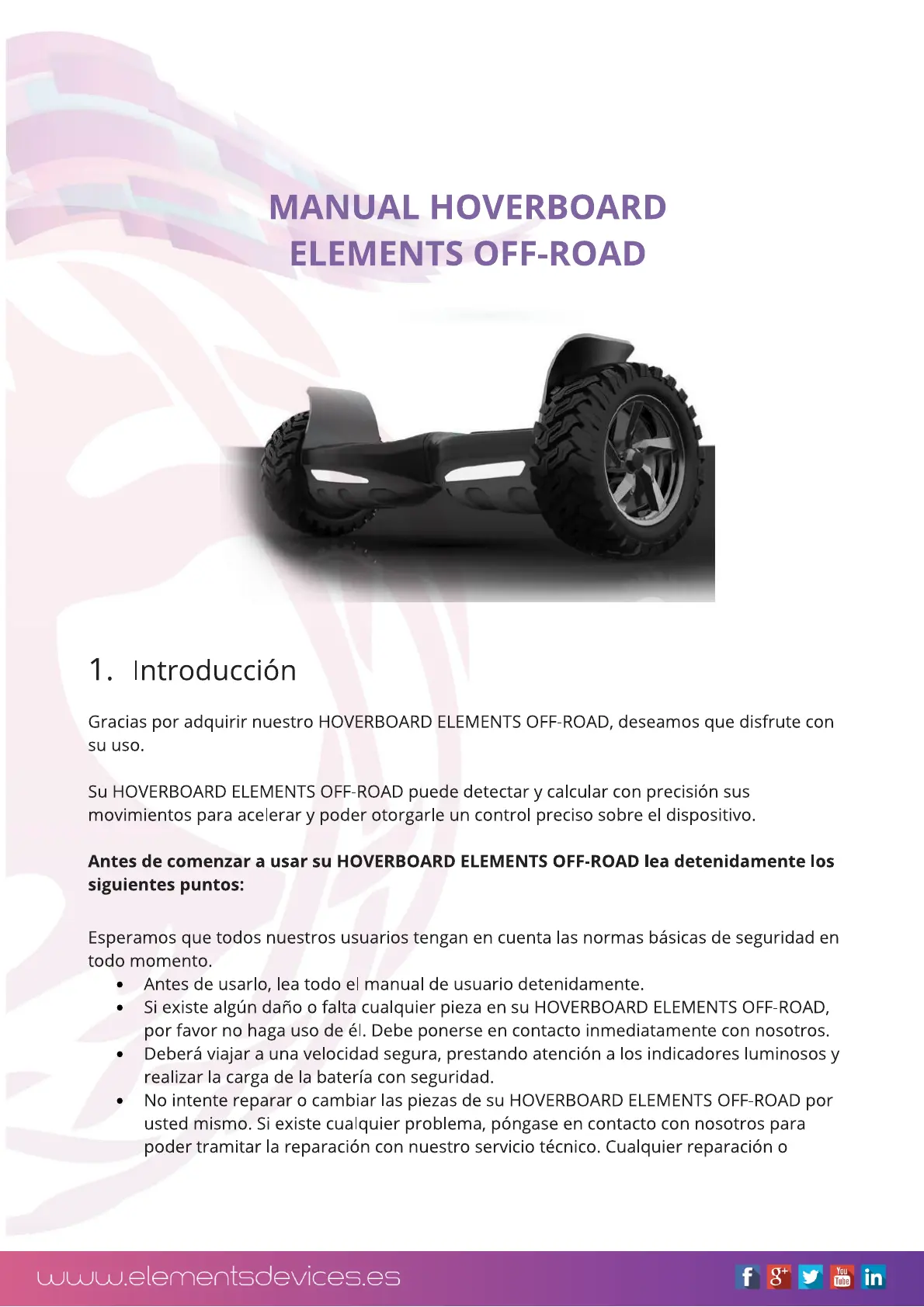 Läs gratis den bruksanvisning för Elements Hoverboard Off-Road (9 sidor) i kategorin Självbalanserande skoter. Guiden har ansetts hjälpsam av 32 personer och har ett genomsnittsbetyg på 4.2 stjärnor baserat på 4 recensioner. Har du en fråga om Elements Hoverboard Off-Road eller vill du ställa frågor till andra användare av produkten? Ställ en fråga
