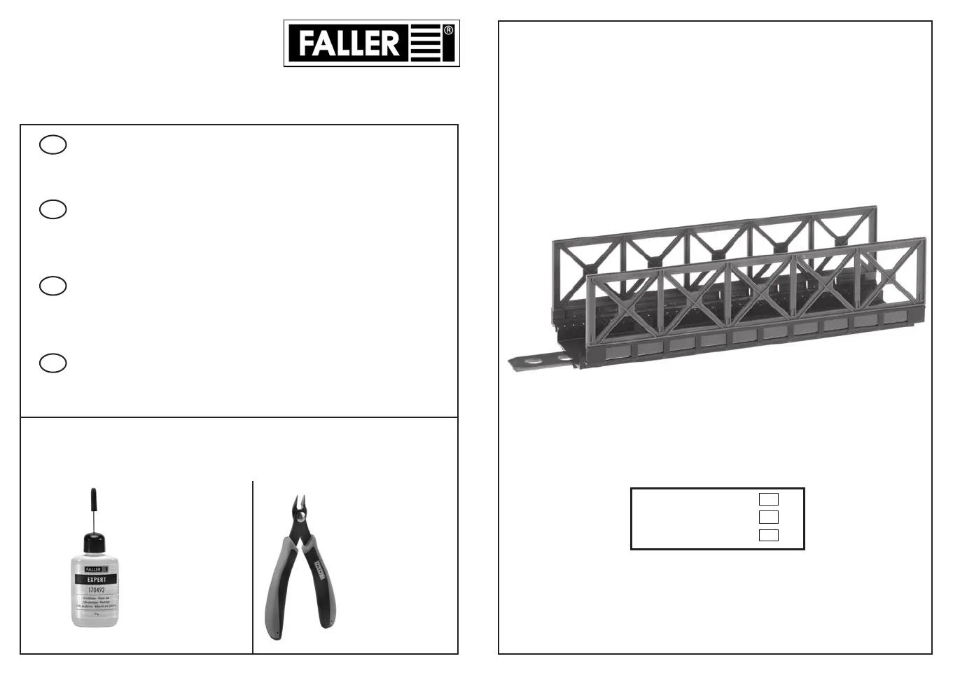 Pour l’assemblage du modèle, nous vous recommandons les articles FALLER suivants (non inclus dans le kit):