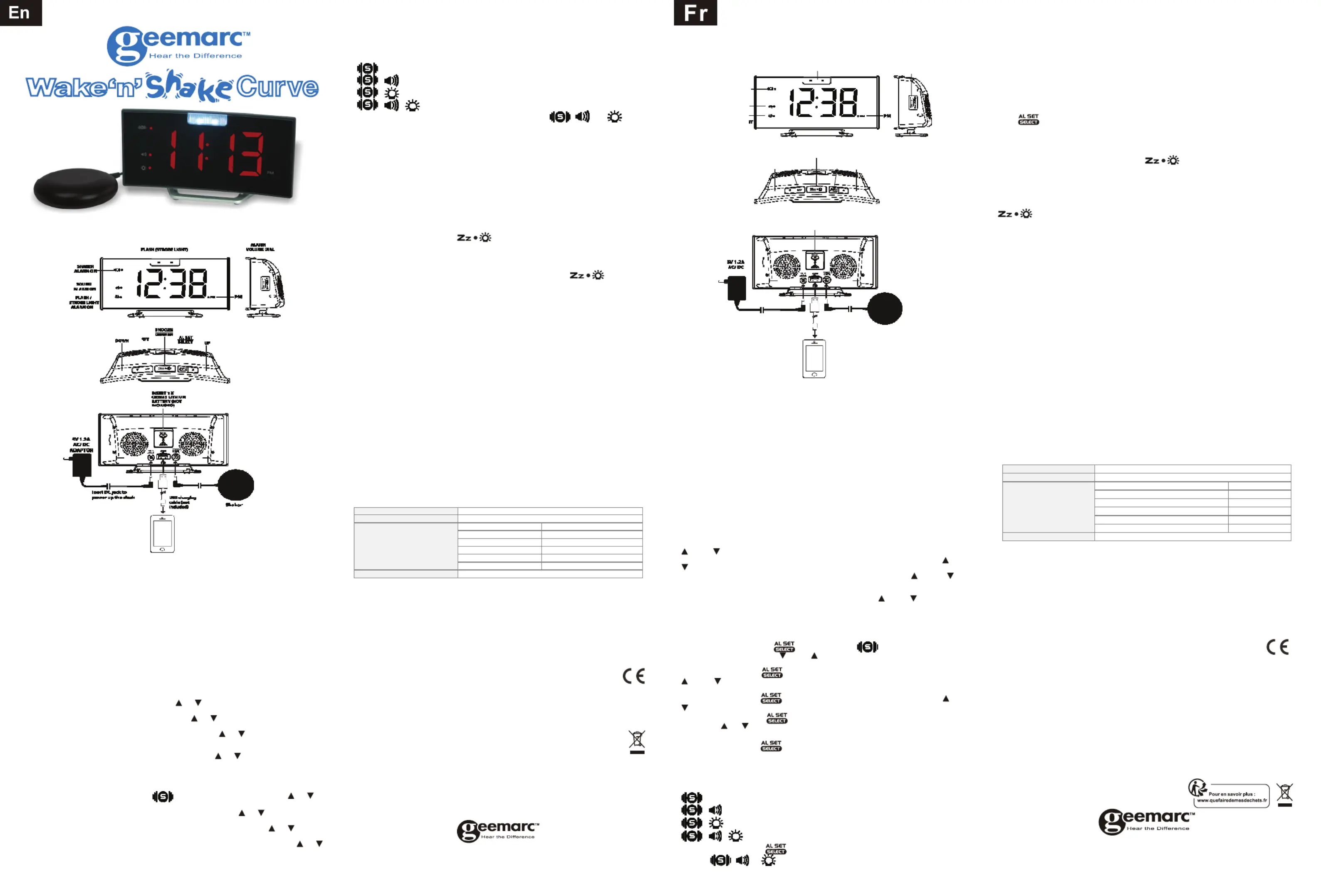 Läs gratis den bruksanvisning för Geemarc Wake 'n Shake Curve (4 sidor) i kategorin Klockradio. Guiden har ansetts hjälpsam av 23 personer och har ett genomsnittsbetyg på 5.0 stjärnor baserat på 12 recensioner. Har du en fråga om Geemarc Wake 'n Shake Curve eller vill du ställa frågor till andra användare av produkten? Ställ en fråga