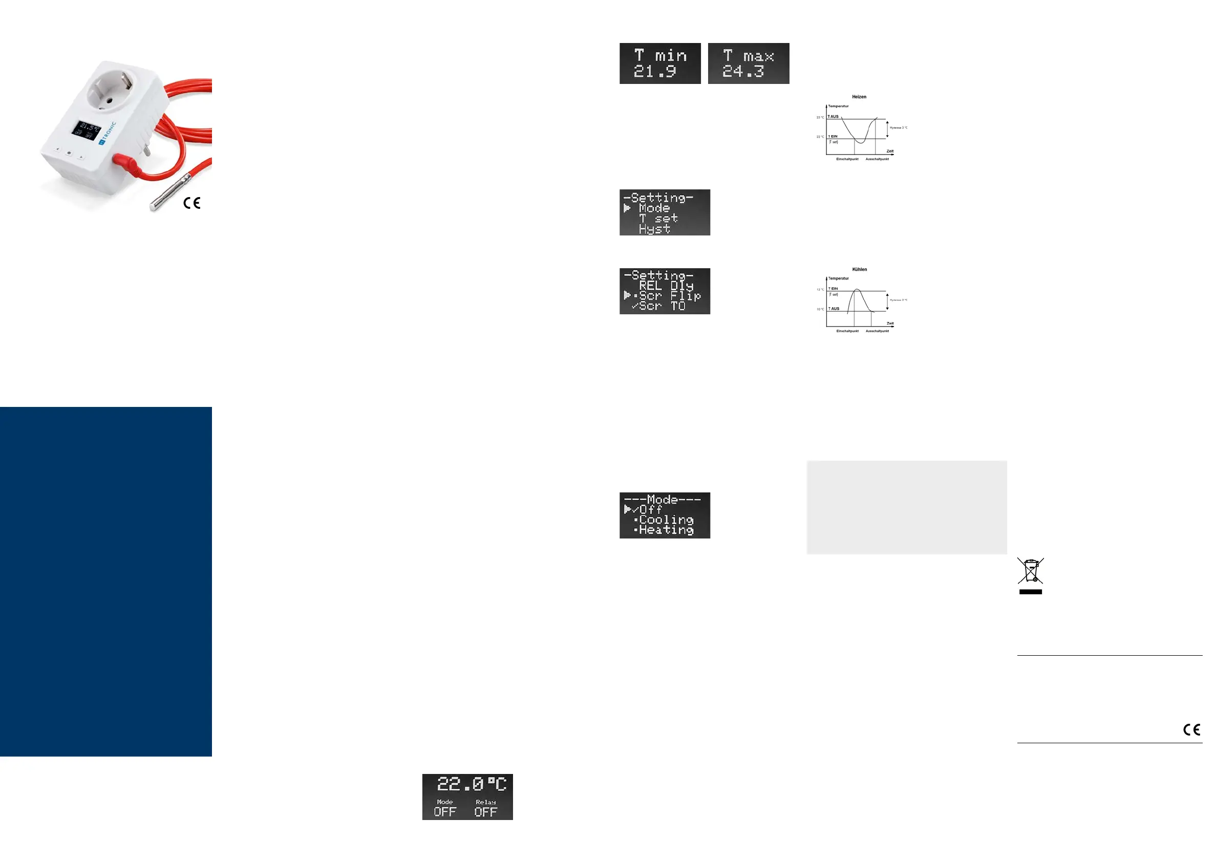 Hz, max. 10 A, 2300 VA) temperaturgesteuert ein- oder aus-