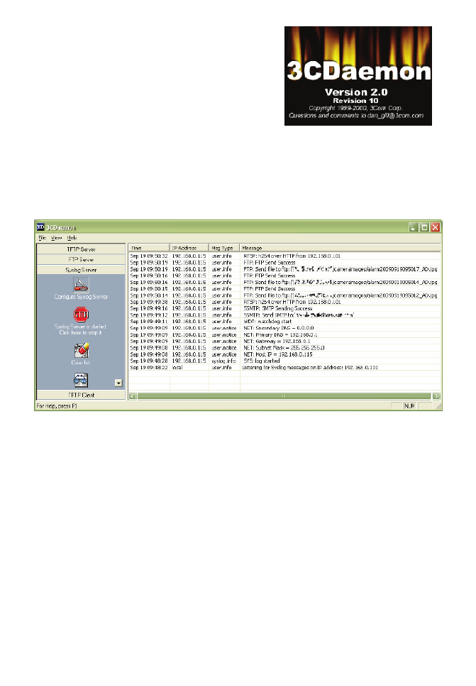 Syslog server, the 3CDaemon utility by 3Com Corporation (Download Location: