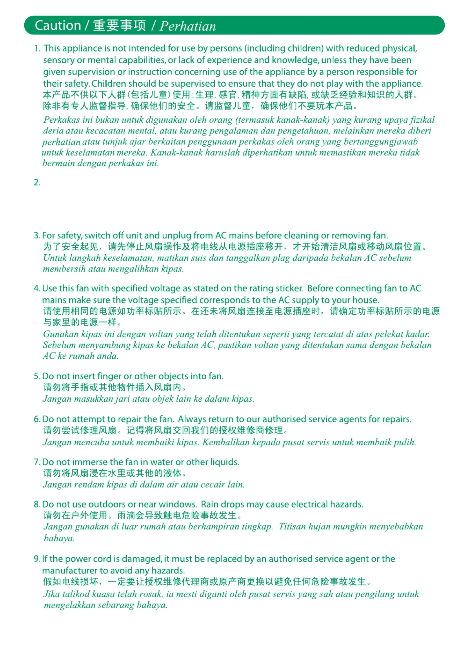 Kipas hendaklah dipasang pada paras yang tinggi supaya bilah berada lebih daripada 2.5 meter