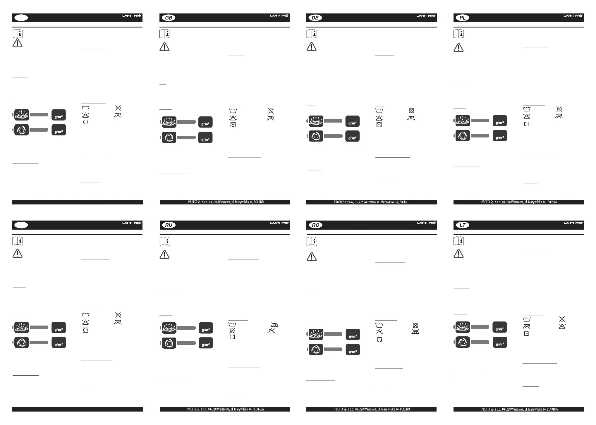 Ubrania są oznakowane: znak LAHTI PRO, znak CE, numer artykułu,