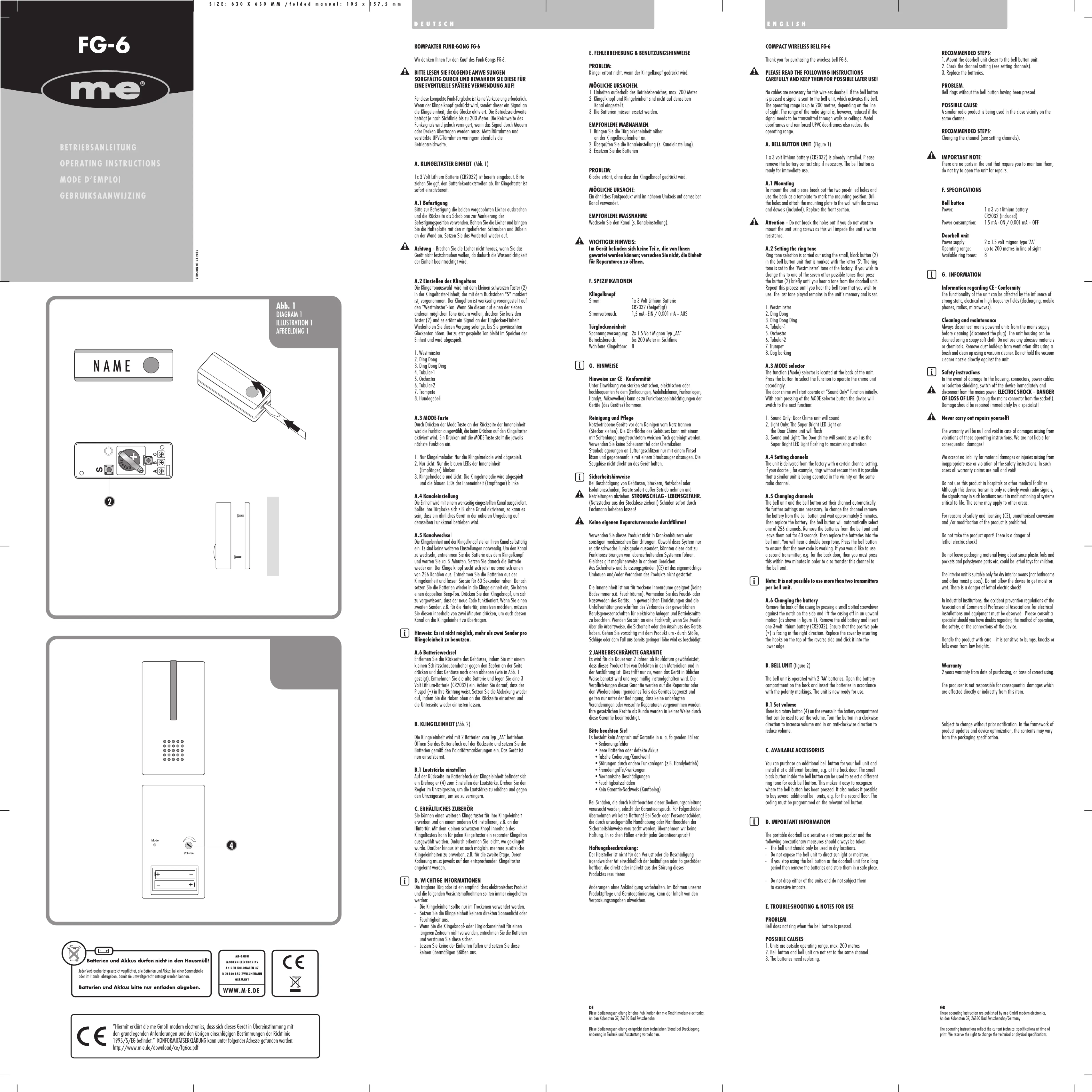 Läs gratis den bruksanvisning för M-e FG-7 (3 sidor) i kategorin Dörrklocka. Guiden har ansetts hjälpsam av 4 personer och har ett genomsnittsbetyg på 4.2 stjärnor baserat på 2.5 recensioner. Har du en fråga om M-e FG-7 eller vill du ställa frågor till andra användare av produkten? Ställ en fråga