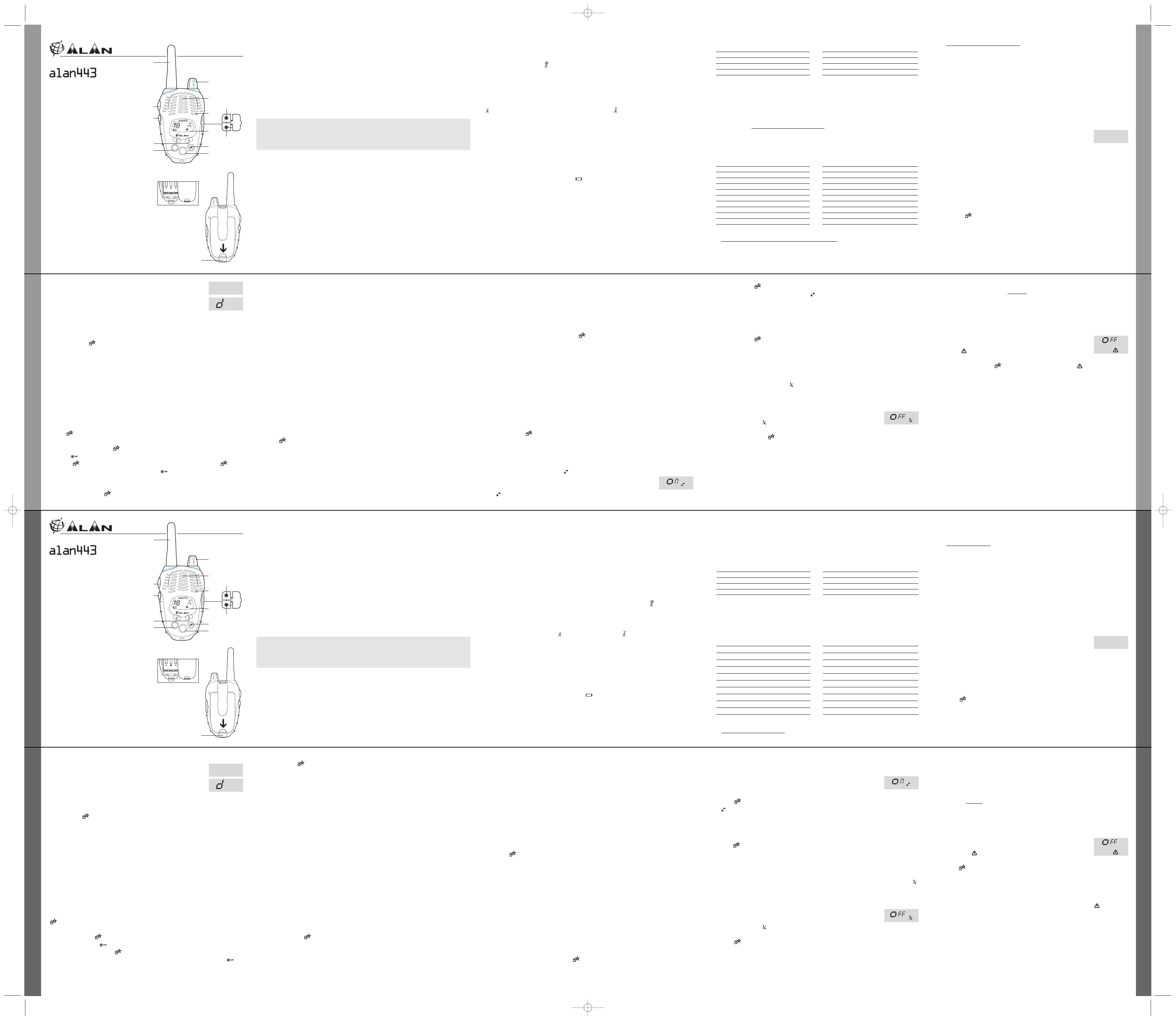 Läs gratis den bruksanvisning för Midland ALAN 443 (6 sidor) i kategorin Walkie-talkies. Guiden har ansetts hjälpsam av 9 personer och har ett genomsnittsbetyg på 4.7 stjärnor baserat på 5 recensioner. Har du en fråga om Midland ALAN 443 eller vill du ställa frågor till andra användare av produkten? Ställ en fråga