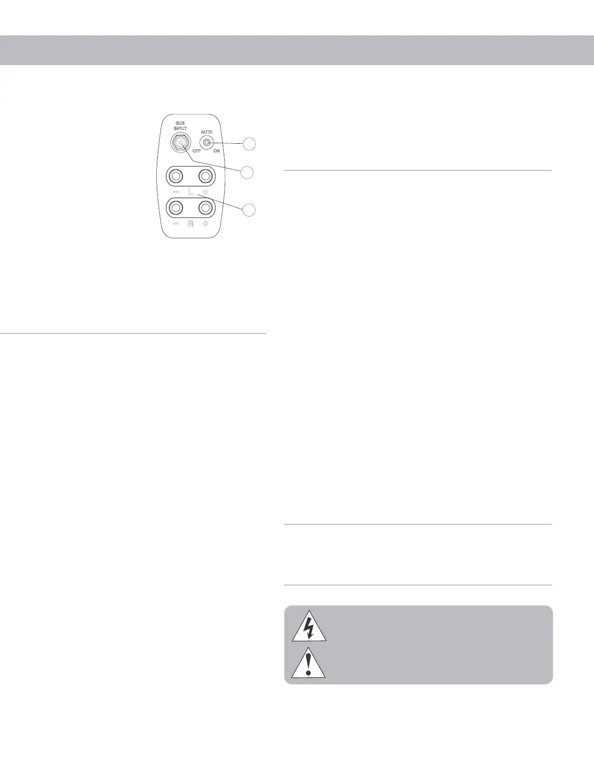 damage your electronics. Plug your MIRAGE subwoofer into an AC outlet. Do not use
