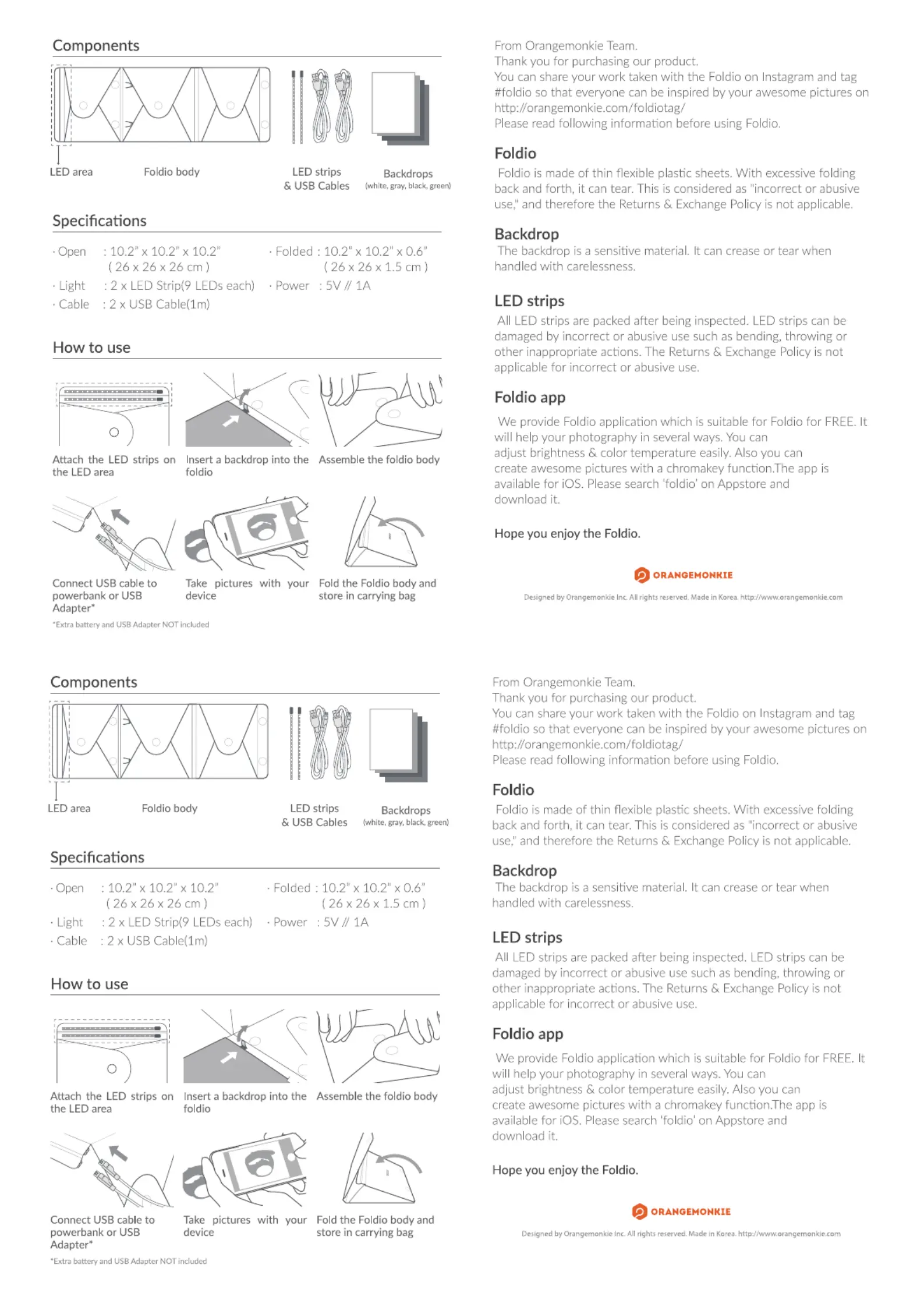 Läs gratis den bruksanvisning för Orangemonkie Foldio1 (1 sidor) i kategorin ej kategoriserat. Guiden har ansetts hjälpsam av 3 personer och har ett genomsnittsbetyg på 4.8 stjärnor baserat på 2 recensioner. Har du en fråga om Orangemonkie Foldio1 eller vill du ställa frågor till andra användare av produkten? Ställ en fråga