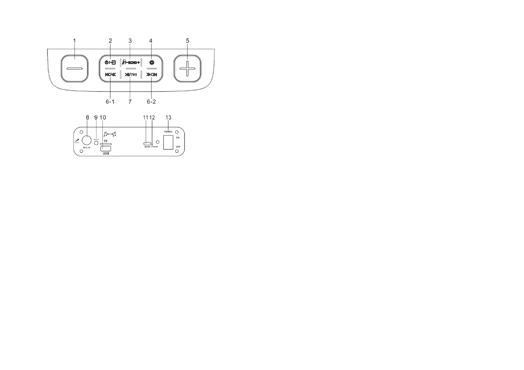 6-1. Previous track / Mic volume -. Press once to previous song. Long press to decrease