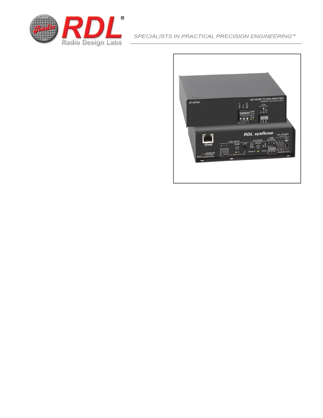 APPLICATION: The SF-NP50A is an audio power amplifier that converts one Dante network audio channel and one analog input to a 70 V or 100 V