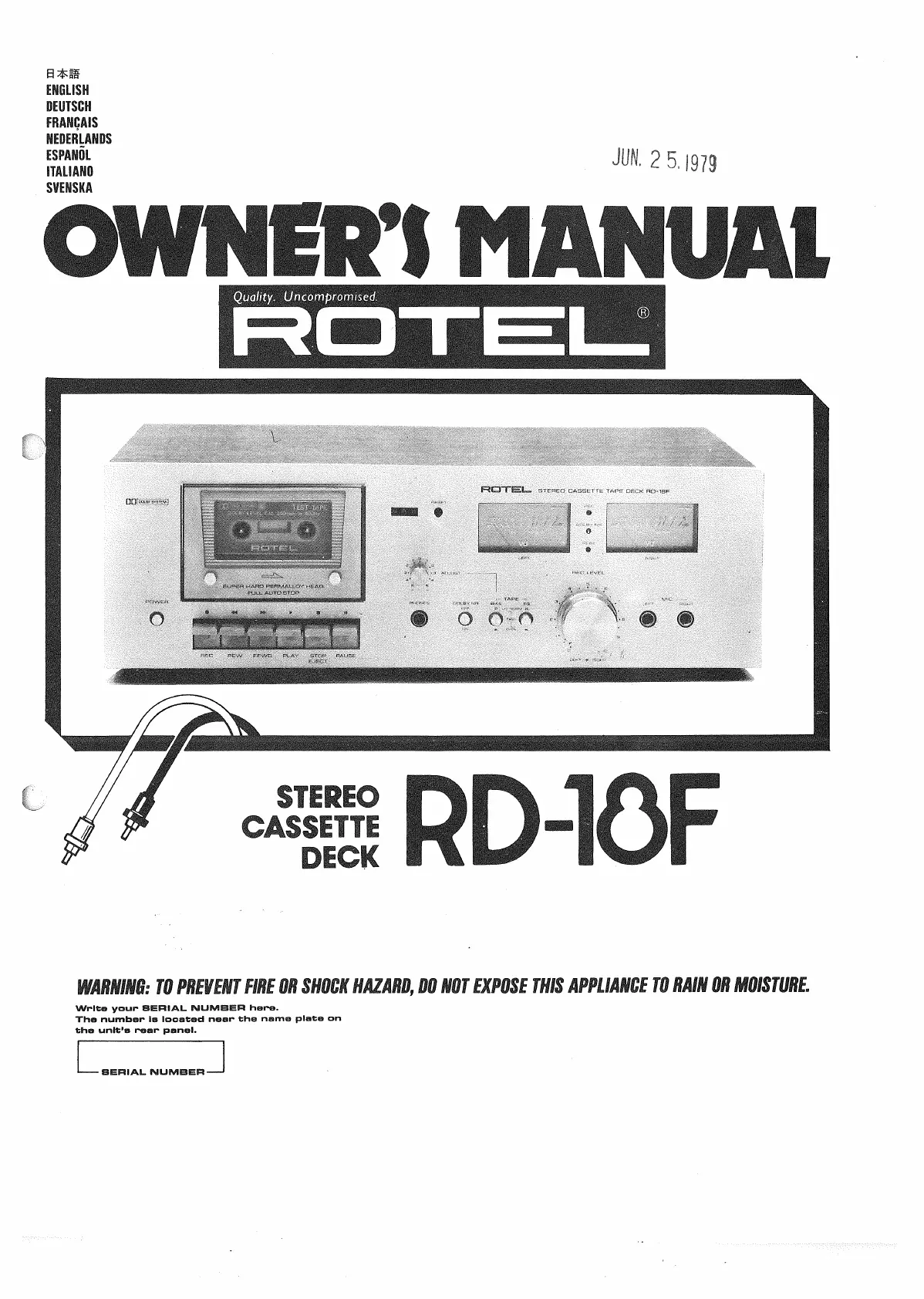 Läs gratis den bruksanvisning för Rotel RD-18F (15 sidor) i kategorin Kassettspelare. Guiden har ansetts hjälpsam av 21 personer och har ett genomsnittsbetyg på 5.0 stjärnor baserat på 11 recensioner. Har du en fråga om Rotel RD-18F eller vill du ställa frågor till andra användare av produkten? Ställ en fråga