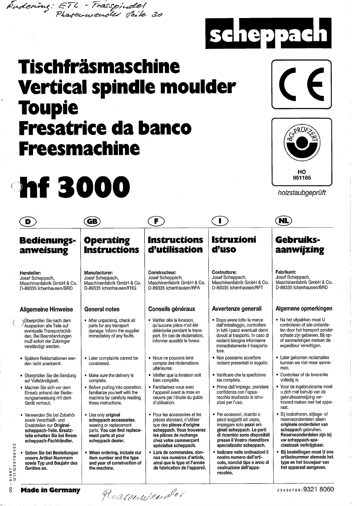 Scheppach hf 3000 Bruksanvisning