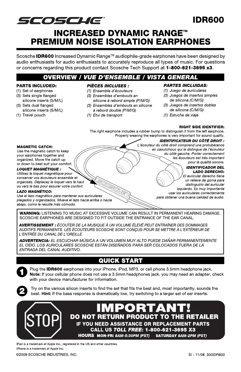 Läs gratis den bruksanvisning för Scosche IDR600 (4 sidor) i kategorin Hörlurar. Guiden har ansetts hjälpsam av 14 personer och har ett genomsnittsbetyg på 5.0 stjärnor baserat på 7.5 recensioner. Har du en fråga om Scosche IDR600 eller vill du ställa frågor till andra användare av produkten? Ställ en fråga