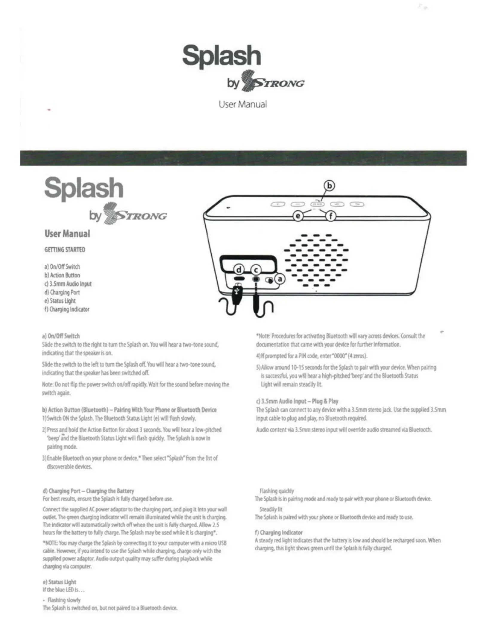 Läs gratis den bruksanvisning för Strong Splash (3 sidor) i kategorin högtalare. Guiden har ansetts hjälpsam av 16 personer och har ett genomsnittsbetyg på 4.4 stjärnor baserat på 8.5 recensioner. Har du en fråga om Strong Splash eller vill du ställa frågor till andra användare av produkten? Ställ en fråga