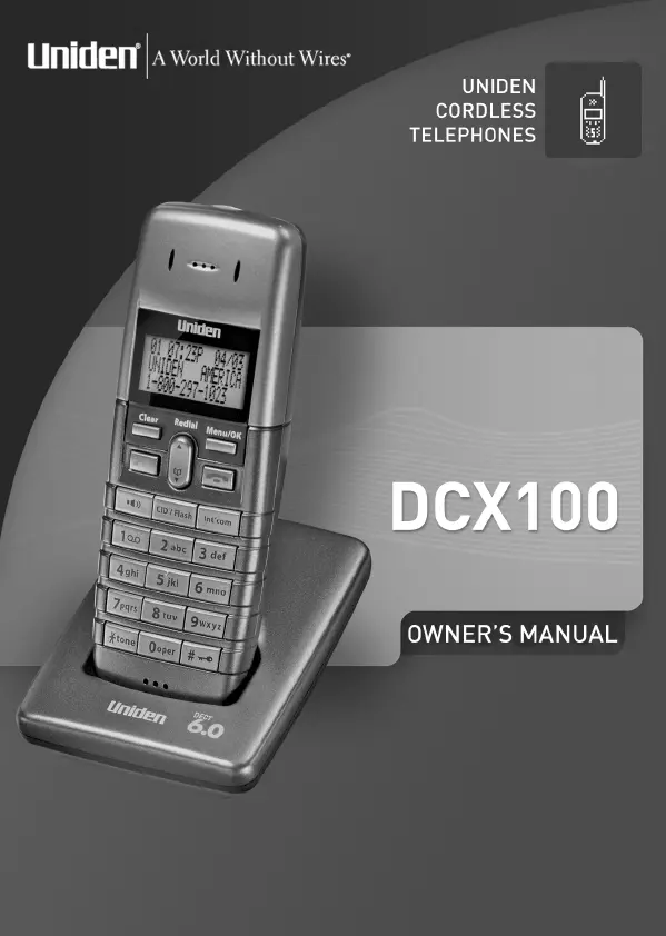 Läs gratis den bruksanvisning för Uniden DCX 100 (12 sidor) i kategorin Telefon. Guiden har ansetts hjälpsam av 14 personer och har ett genomsnittsbetyg på 4.8 stjärnor baserat på 7.5 recensioner. Har du en fråga om Uniden DCX 100 eller vill du ställa frågor till andra användare av produkten? Ställ en fråga