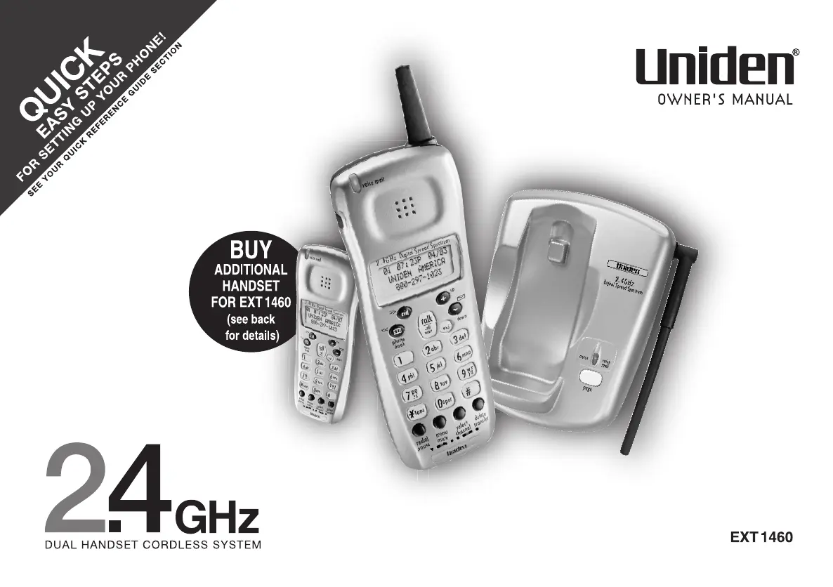Läs gratis den bruksanvisning för Uniden EXT 1460 (62 sidor) i kategorin Trådlösa telefoner. Guiden har ansetts hjälpsam av 42 personer och har ett genomsnittsbetyg på 3.7 stjärnor baserat på 21.5 recensioner. Har du en fråga om Uniden EXT 1460 eller vill du ställa frågor till andra användare av produkten? Ställ en fråga