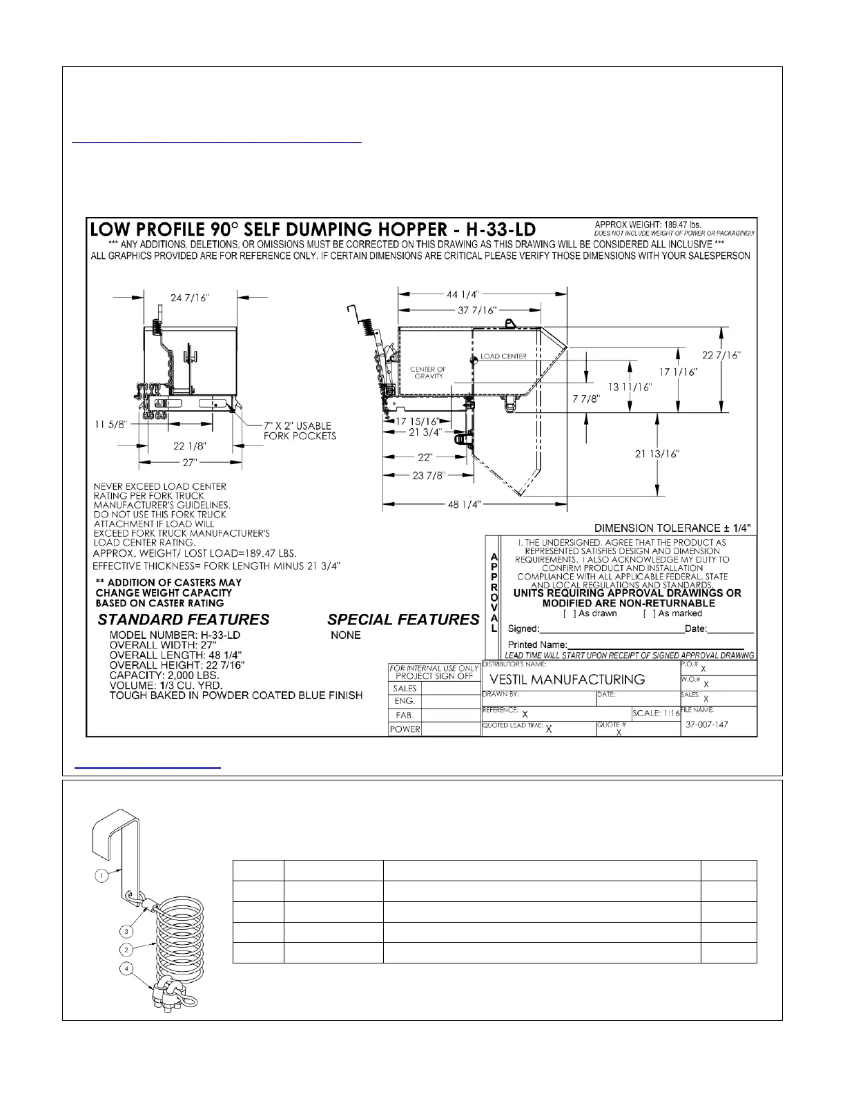 Documents that provide specifications for H-series hoppers are available online to anyone who visits Vestil’s