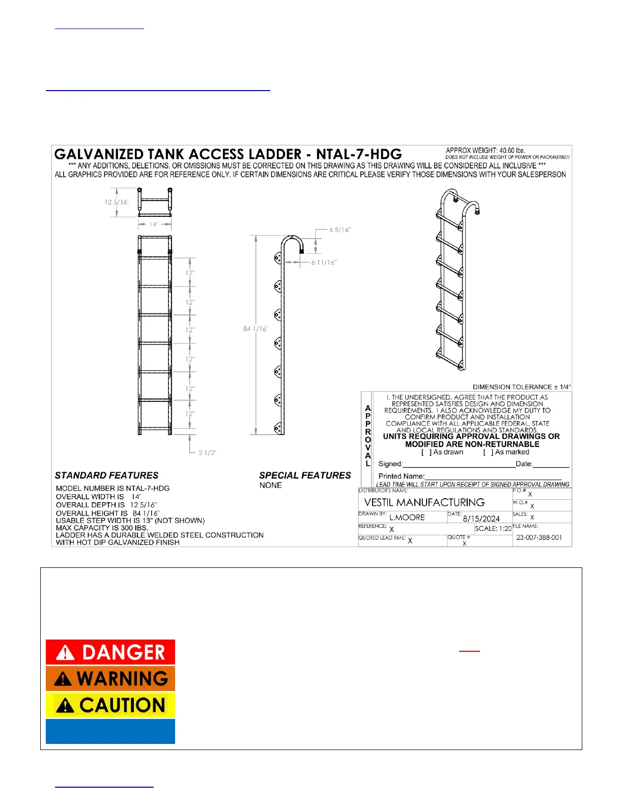 Specifications documents for NTAL-series tank access ladders are provided on Vestil’s website. To access