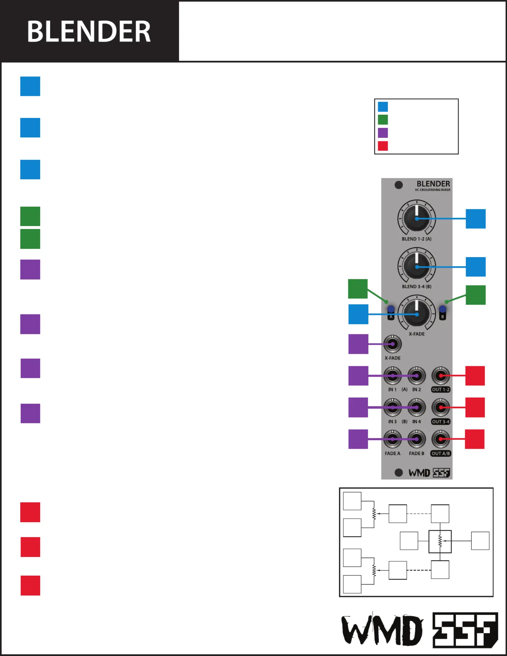 BLENDER is a four channel mixer and voltage controlled cross-fader. BLENDER simplies mixing