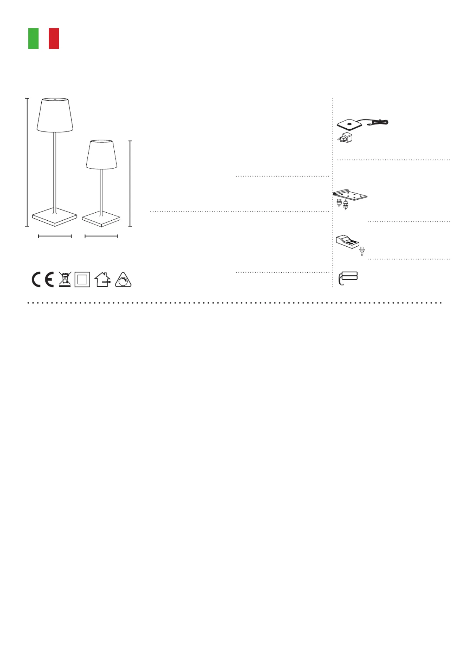 - Base di ricarica singola: INPUT AC220-240V 50/60Hz; OUTPUT 5Vdc - 1A; USB line 1.2 Mt.
